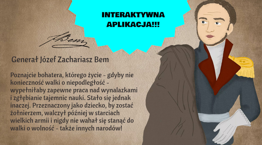 W kamienicy na przedmieściach Tarnowa przychodzi na świat mały Józio. Jakich przedmiotów Józio uczył się w szkole? Z czego zasłynął, jako dorosły Józef? Poznaj życie i dokonania generała Józefa Bema rozwiązując interaktywne zadania.