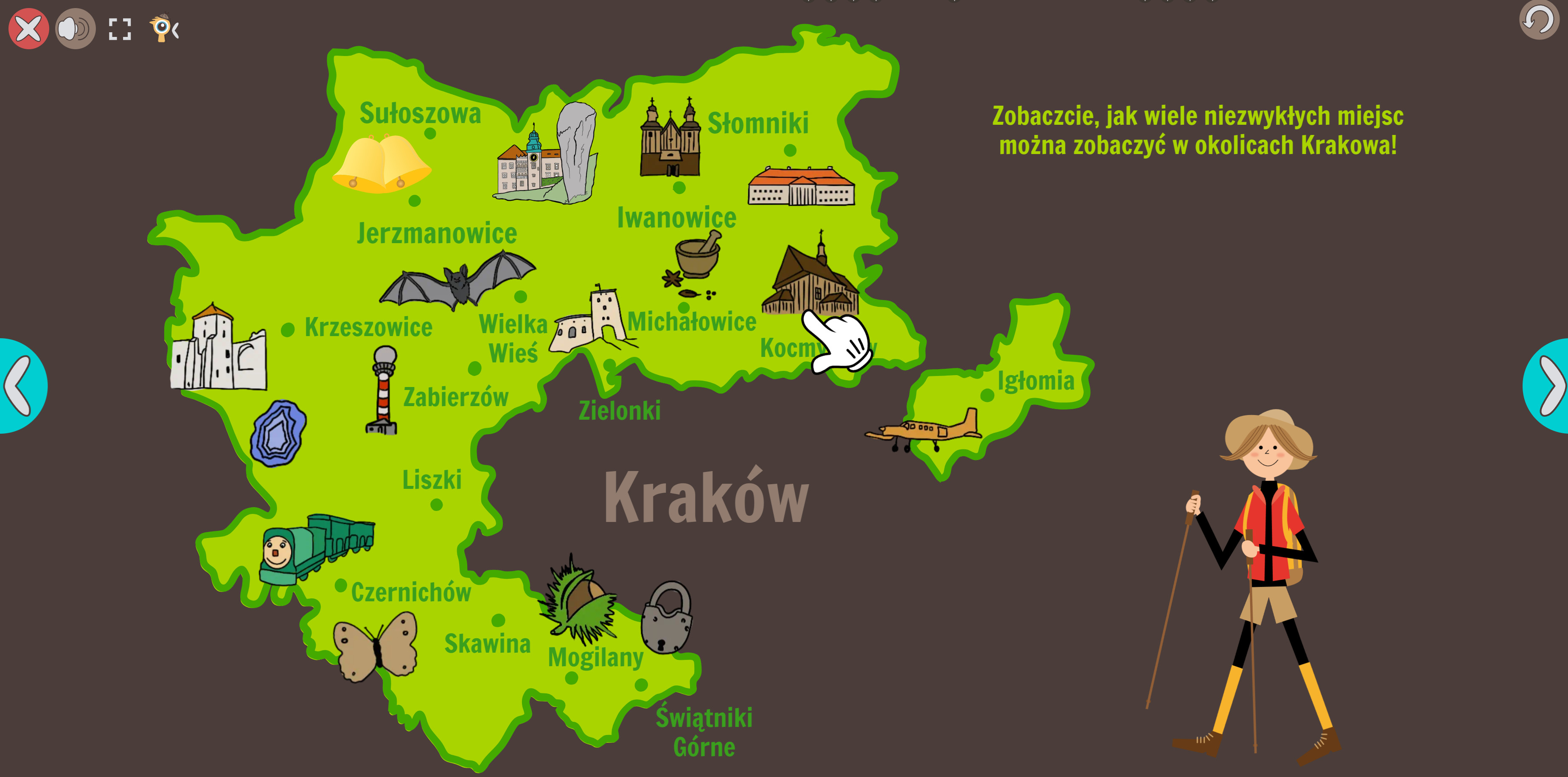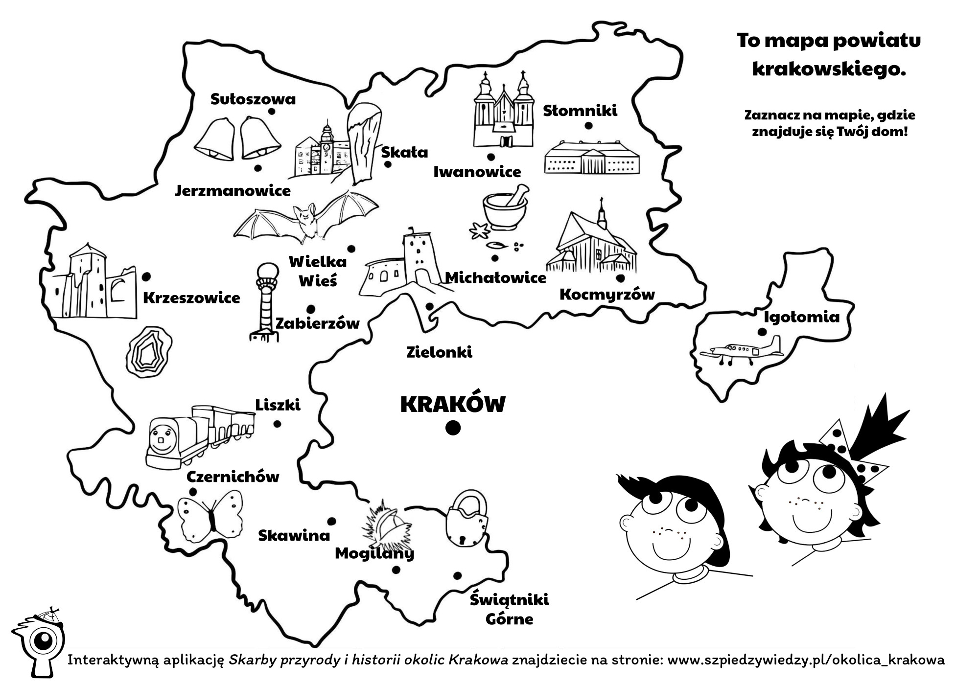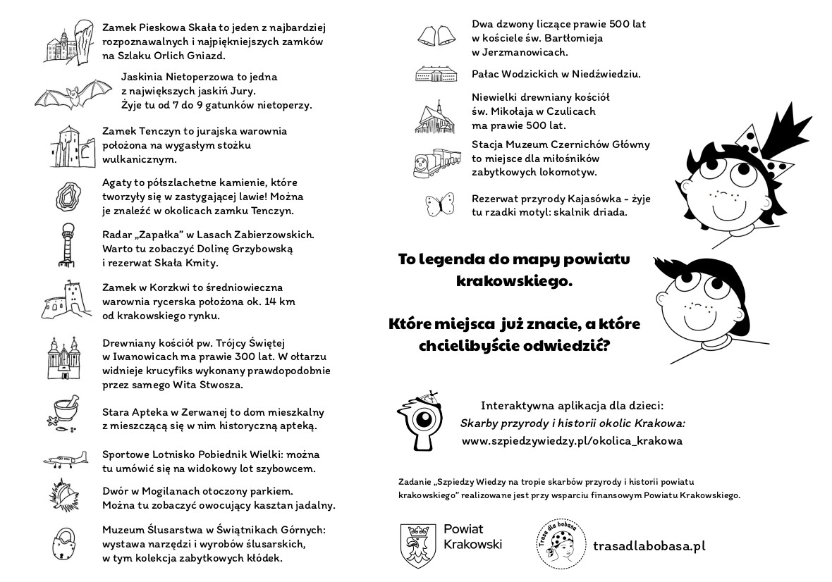Uzupełnieniem drukowanych kart edukacyjnych jest interaktywna aplikacja pełna ciekawostek i zagadek, z klikalną mapą powiatu krakowskiego. Znajdziecie ją pod linkiem: